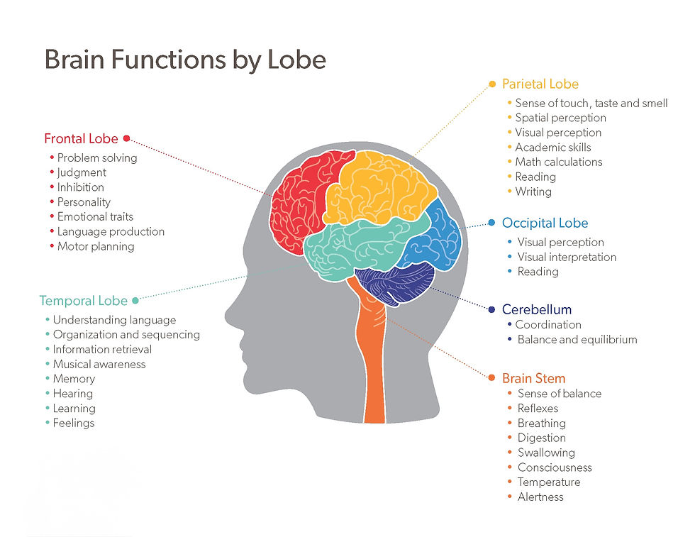 The human brain is one of the most complex and fascinating organs in the body. It controls everything we do - from breathing and movement to decision-making, emotions, and memory. The image above provides a simplified, colour-coded breakdown of the brain’s key regions and their functions. While it separates the brain into distinct areas, it’s important to remember that these regions work together constantly.